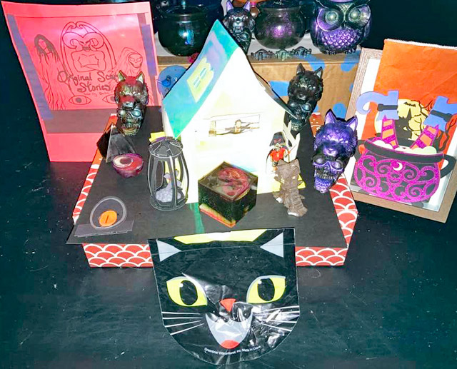 Domenica has created a virtual world with her spooky submissions. This one shows the Vulture Gulch mercantile by itself, So many great features with he cats and the pumpkins, but I love the bags! Mercantile-esque!