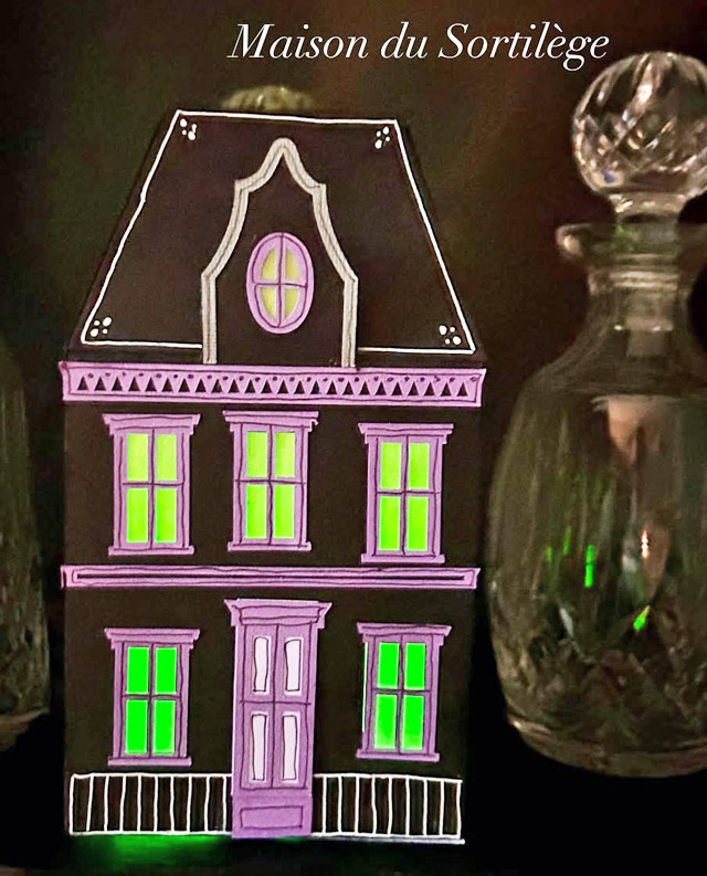 I love this little house with its richness of visual features. The cat in the front is so ominous, along with the wolf creatures! Please someone save the witch in the cauldron!