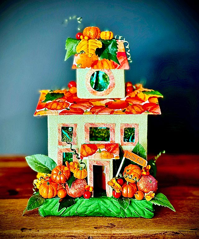 This house by Kay is a joyous scene. Have you ever seen a happier ghost? To be behind three such lovely pumpkins! The colors and the distressing on the walls are magical.
