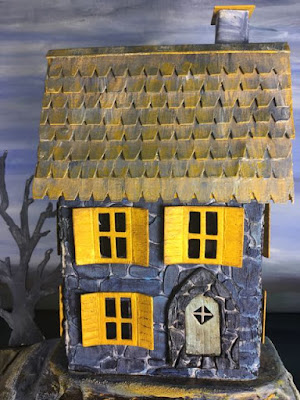Whoops! Forgot to put in a front step. I will remember to do that. I tried to make the door archway more prominent, but I painted them the same color. Next time I will make 2-3 layers of cardboard to make the archway stand out better. Always learning. I hand cut the shingles rather than use the Village Rooftop die because I wanted them to be less symmetrical and more wonky, but really it's not much different from using the Village Rooftop die.
