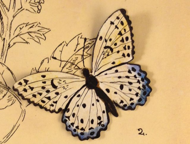 I used a Martha Stewart butterfly punch for the butterflies and colored with them with various inks and pens and crayons and then glued them to a black card stock butterfly for a little more dimension. I glued them to the antique botanical background and then drew the antennae and the description for plate 32 - Polyommatus Arion, Polyommatus Alcon and Polyommatus Corydon. Probably not anatomically accurate, but the coloring is pretty close to the print.