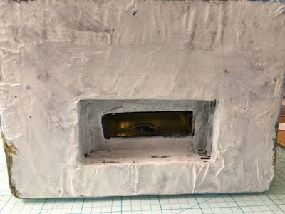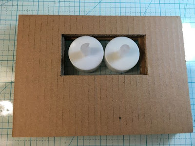 First, I've found it takes about 6 layers of cardboard for the depth of the base to cover the white bottom portion of the light. This is important in the this case because the diameter of the light is 1.5 inches and the width of the last 3 stone-textured houses I've made is 1.25 inches. I made them narrow to both save space and to be able to cut the entire house out of a 8.5 x 11 inch piece of cardboard. So I add a smaller piece on top to make a "hill" and to reduce the size of the hole and allow me to glue the house down effectively.
