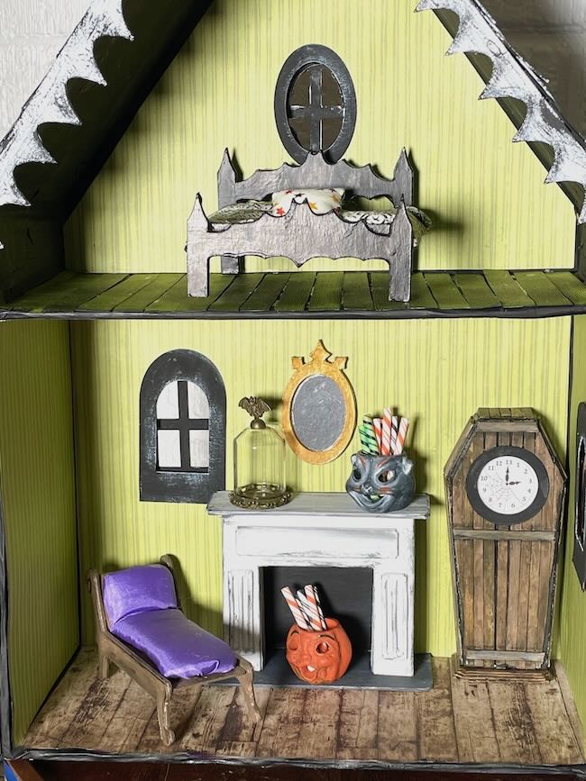 When I decided to make a little dollhouse, eventually I realized that I needed to make things to go in the dollhouse. And that led to dollhouse furniture that ranged from tiny beds, a table and chairs, even a coffin clock and a bat wing bed. Today I'm sharing my chaise lounge the perfect size for the dollhouse.