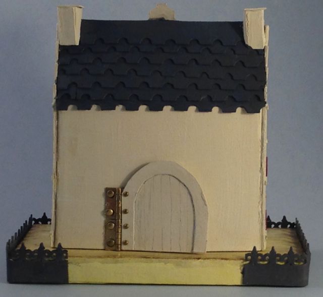 I debated for a long time what kind of fence to use on the Netherlands house - the St. Joris Doelen Guild House. I even stenciled a cobblestone base and made a small simple fence to go with it, but I thought it detracted from the house. Finally I settled on a simple light-colored base - ochre and white gesso, antiqued a little with some Tim Holtz distress paint, Ground Espresso. Then I glued together several layers of the Martha Stewart Iron Gate edge punch and painted them the same color as the roof of the house. I am very pleased with how it turned out.
