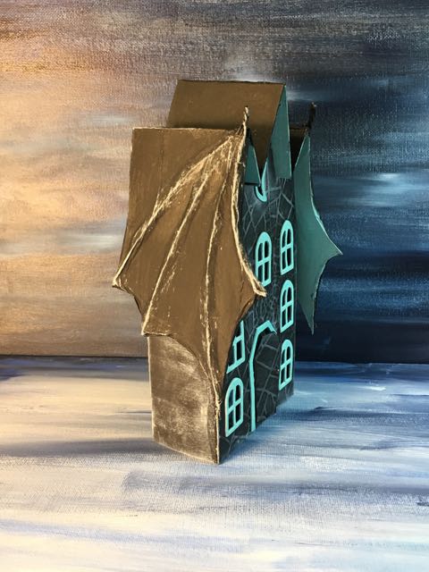 I painted again with the blue underwing color and the black on top. The edges are a little sloppy, but I am fairly happy with it. I still have some touching up to do. The spiderweb embossing is better on the back because it is not interrupted by other elements like windows and doors. I also need to distress the sides a little better.