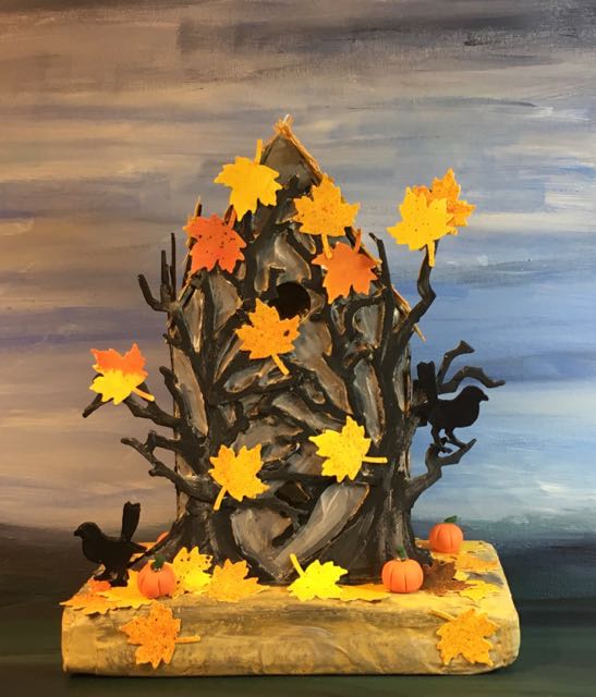I will probably try to make one more house like this, but using paper mache for the tree rather than the Tim Holtz Branch Tree die. I love this die, but I think a paper mache tree will have more dimension and may be easier to paint. Also I will try some smaller leaves. I have a punch of leaf punches including a number of oak leaf punches that I think will work better.